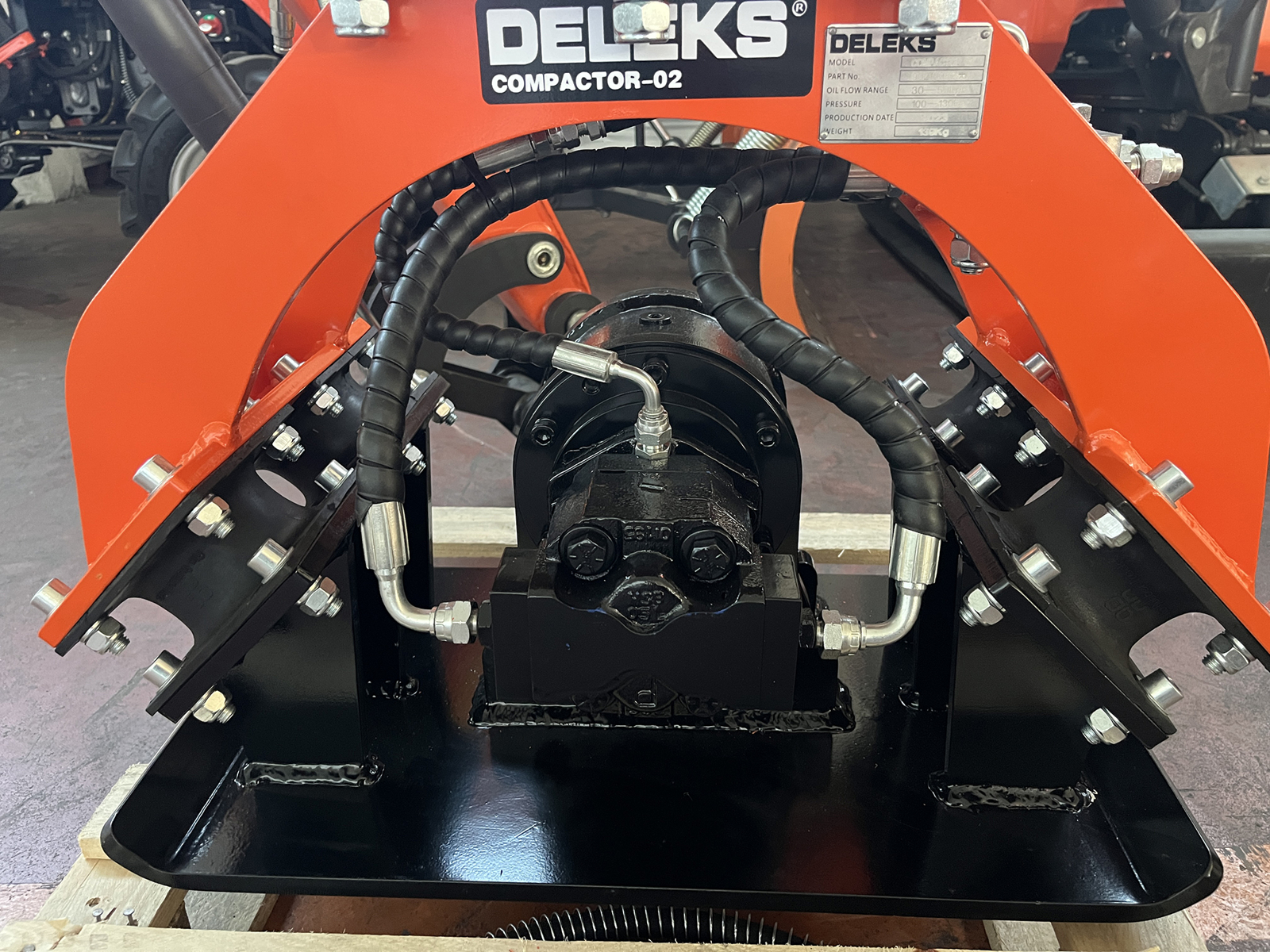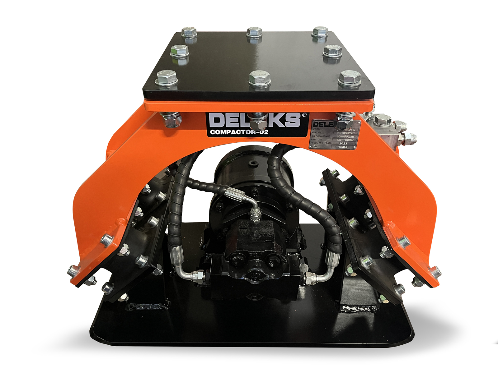 DELEKS® COMPACTOR-02 Bodenverdichter. Der Bagger-Rüttelplatte ist sehr einfach zu installieren und zu benutzen und eignet sich sowohl für einen Skid Steer als auch für einen Minibagger von 1 t bis 2,5 t.