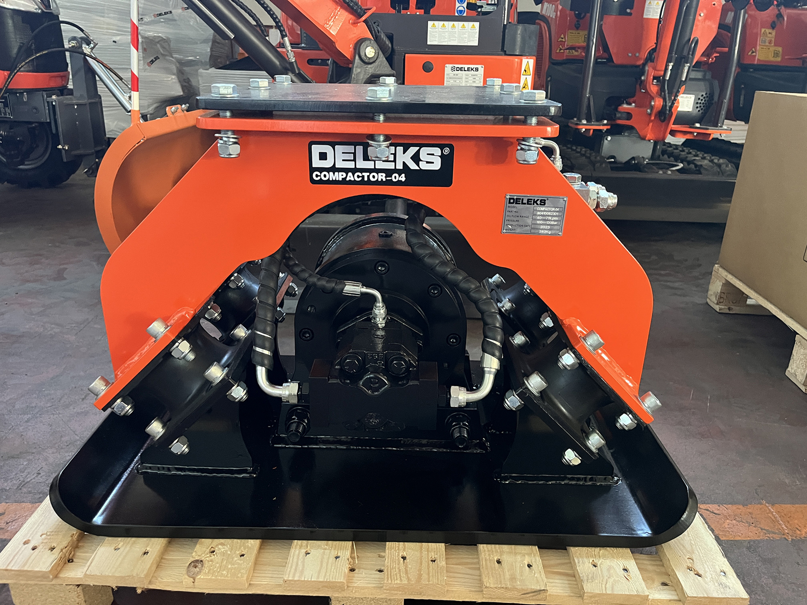 DELEKS® COMPACTOR-04 Bodenverdichter. Der Bagger-Rüttelplatte ist sehr einfach zu installieren und zu benutzen und eignet sich sowohl für einen Skid Steer als auch für einen Minibagger von 4 t bis 10 t.