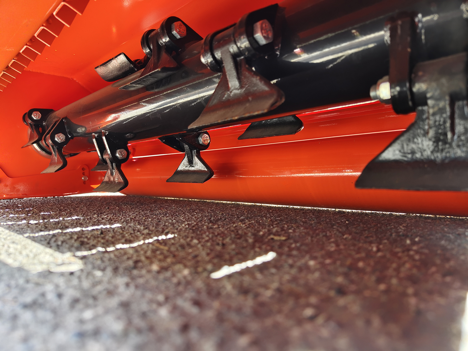 Hydraulische Seitenverstellung für einfaches arbeiten über die Spur hinaus, doppelte, verstärkte Dreipunktaufnahme, dadurch geeignet für Front- und Heckanbau.