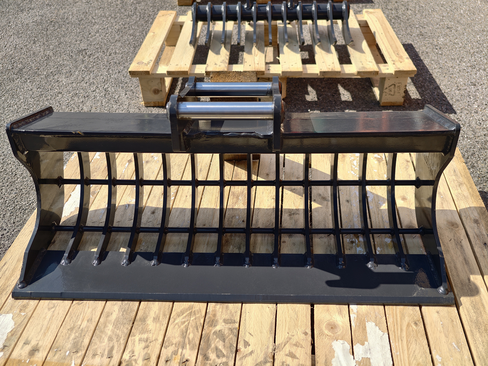 Siebschaufel, Sortierschaufel, Gitterlöffel, Gitterschaufel, Sortiergreifer, Abbruch- und Sortiergreifer speziell für DELEKS®S100 und KUBOTA S100, K008-3, U10-3, K008-5, U10-5 Minibagger entwickelt. Hauptsächlich für das Ausbaggern von Flüssen, das Reinigen von Wasserflächen, etc. verwendet.