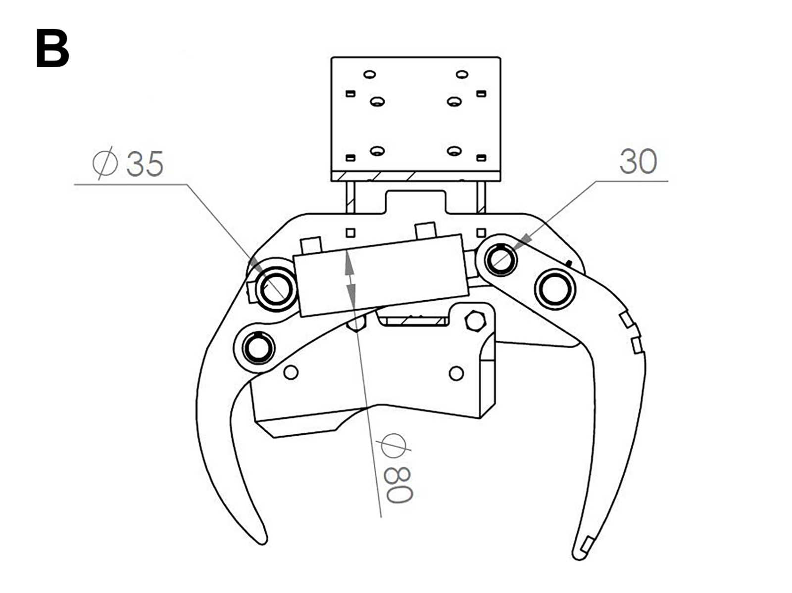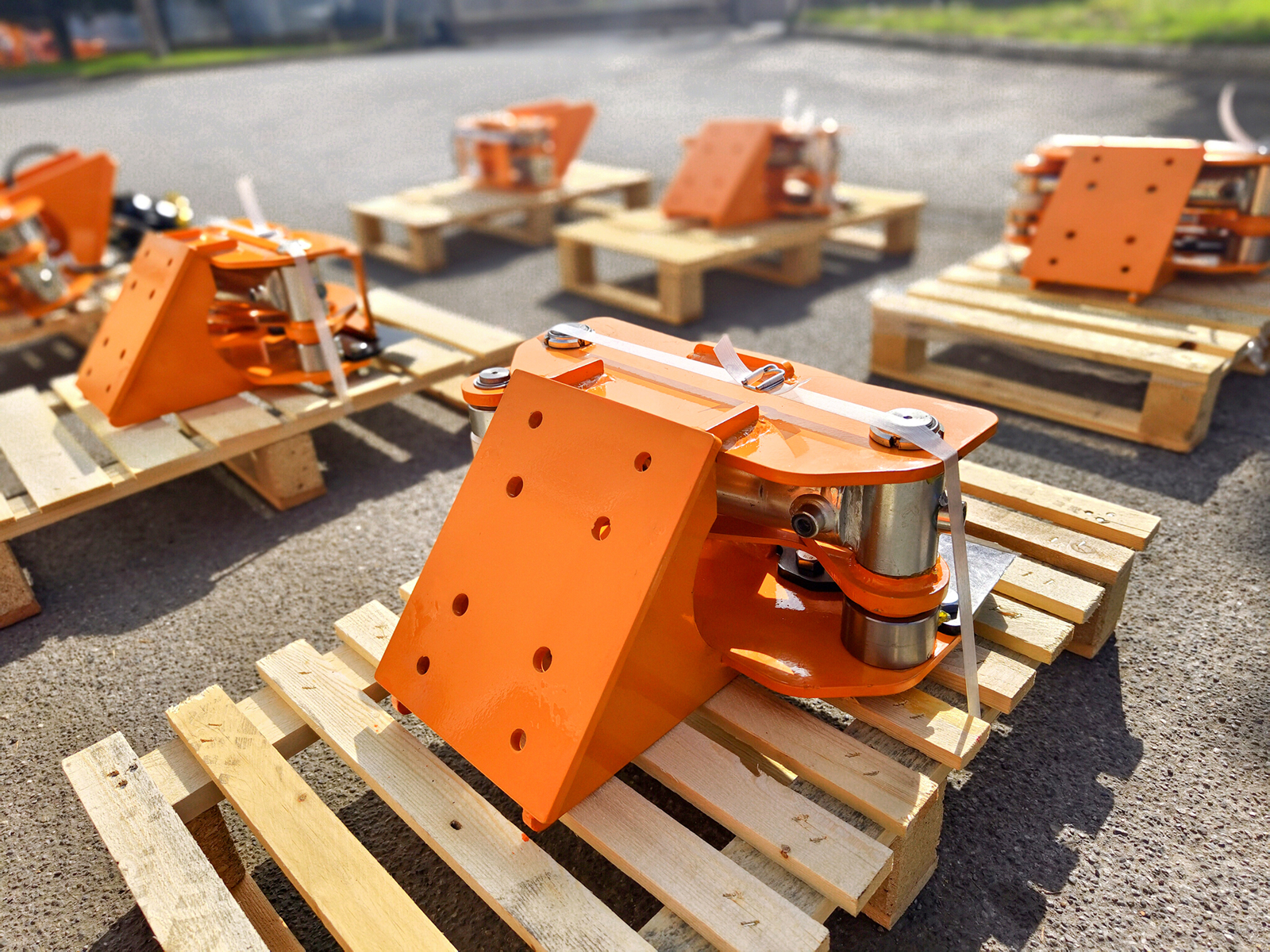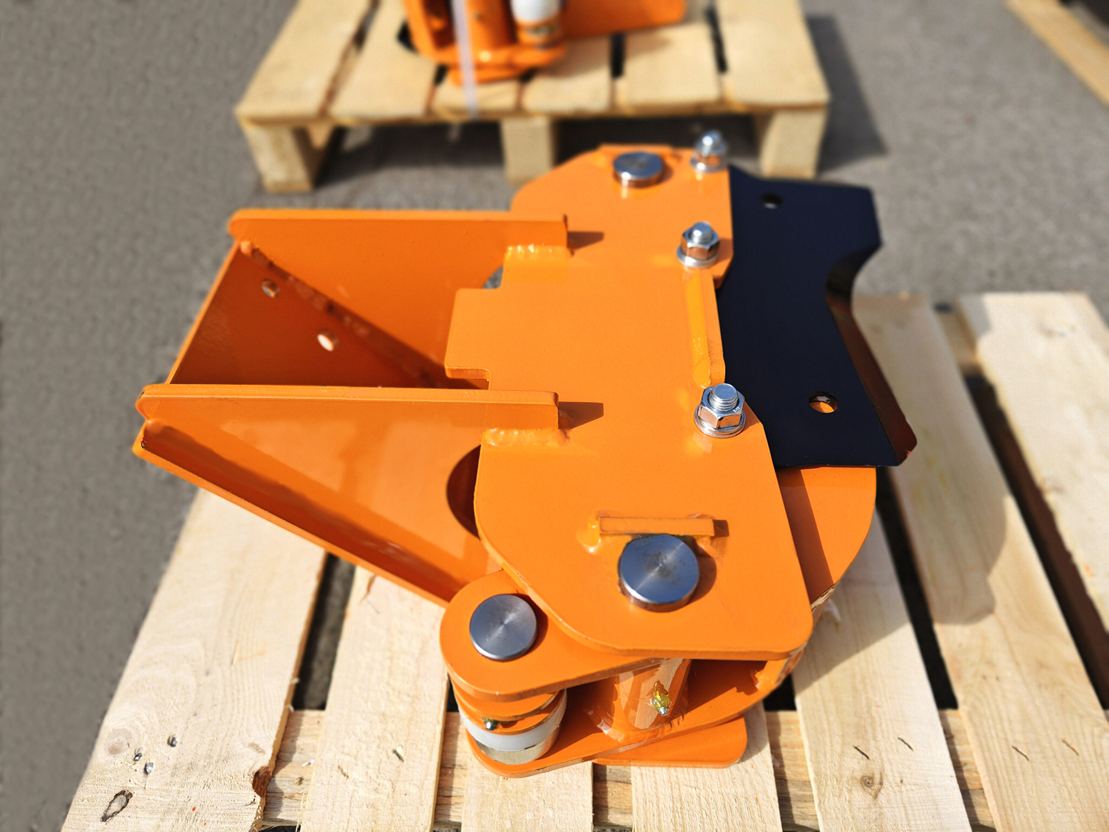 Mit der hydraulischen Baumschere des Minibaggers DELEKS® CF-10 können Bäume gefällt oder dünnere Hölzer zusammen mit dem Greifer zum Schneiden gebündelt werden. Die Schere hat eine starke gehärtete Klinge, die sauber und sicher durch das Holz schneidet.
