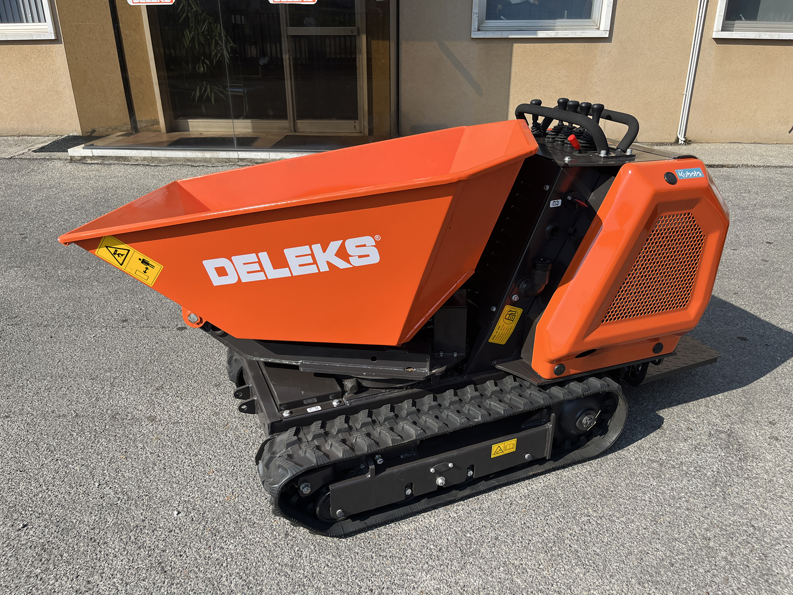 DELEKS® M8000R-BS professional tracked mini dumper with 180° three-way discharge, hydraulic lift and rotation, hydrostatic transmission, operator platform and Briggs & Stratton engine with electric start.