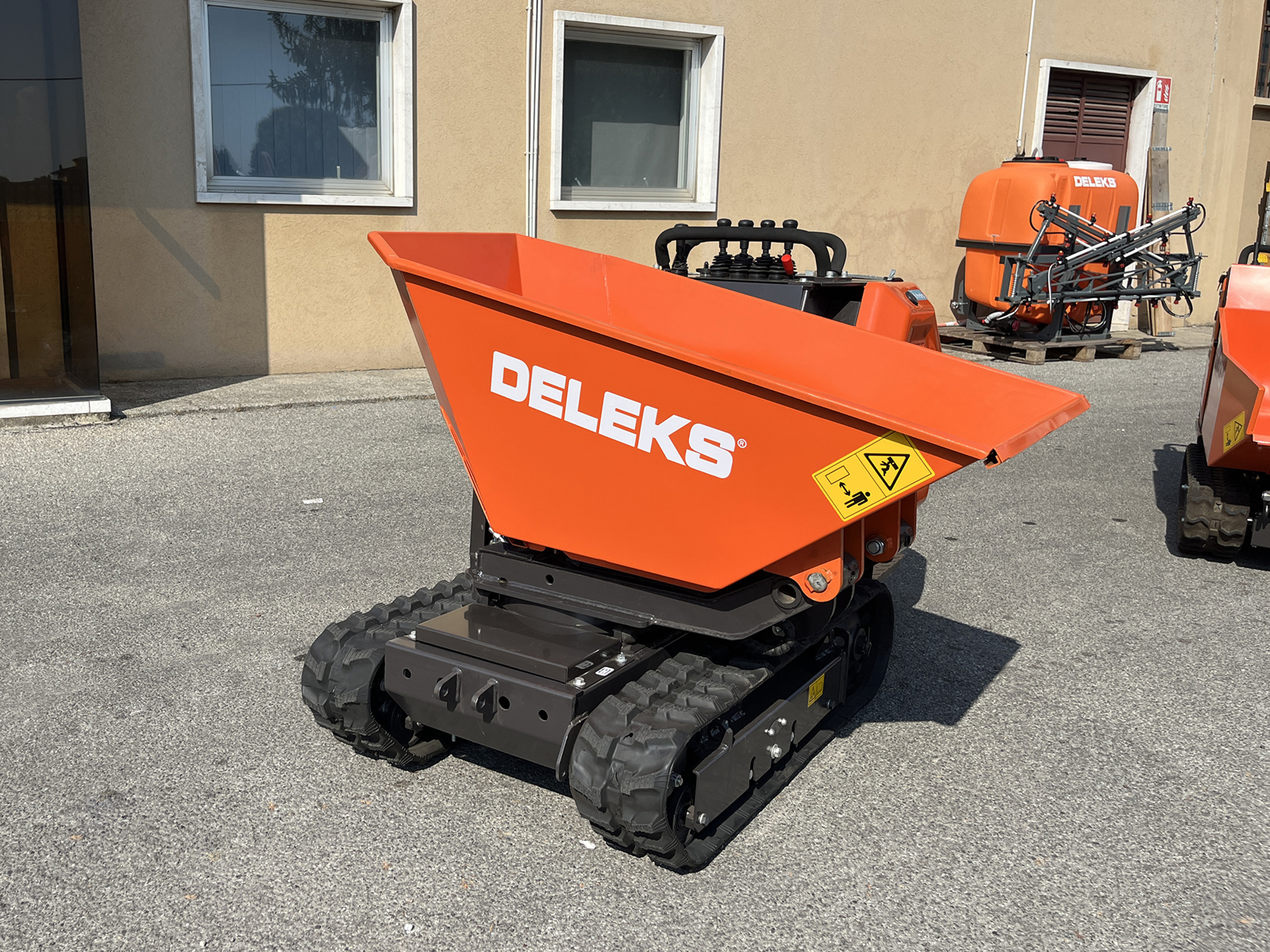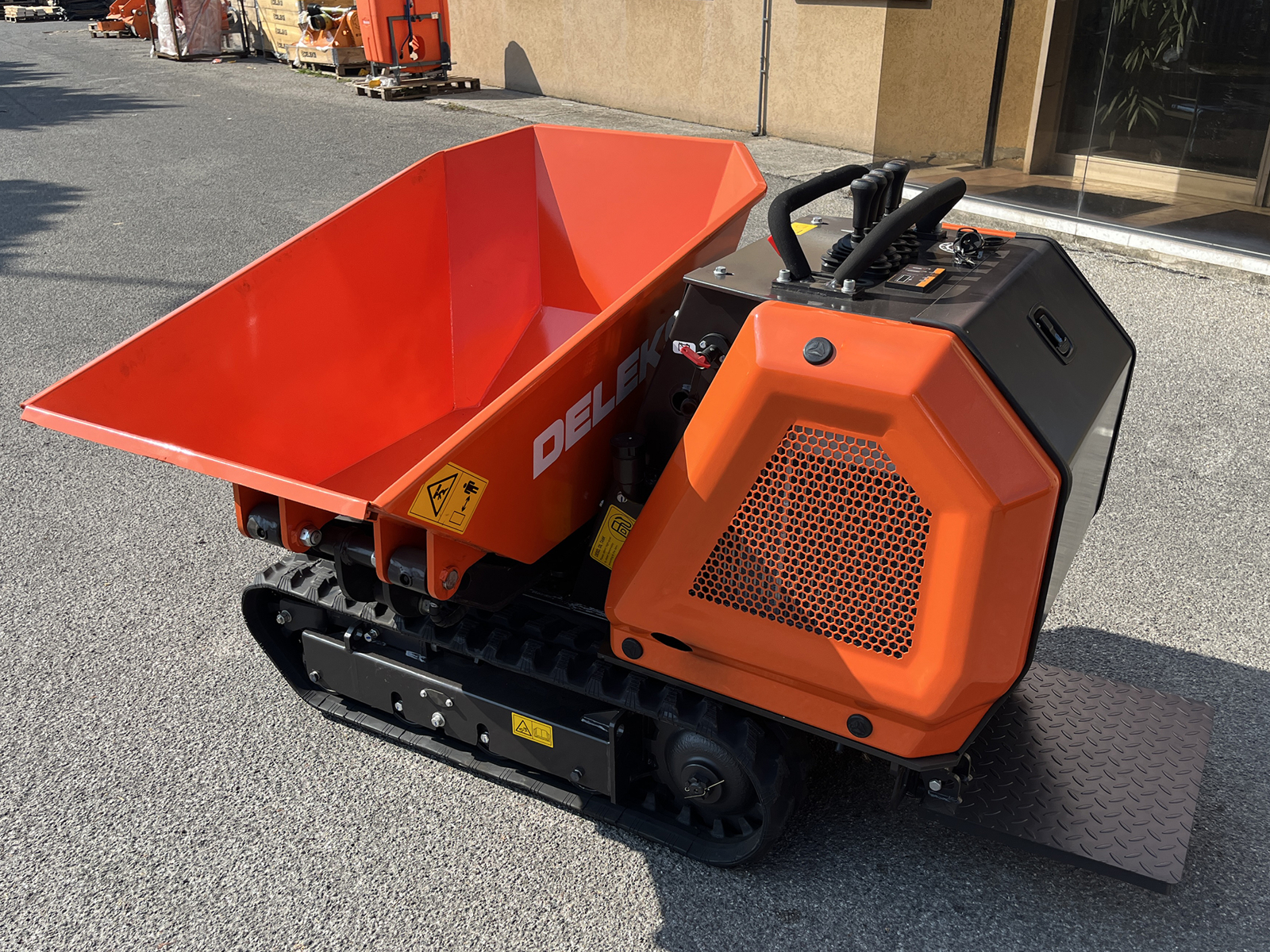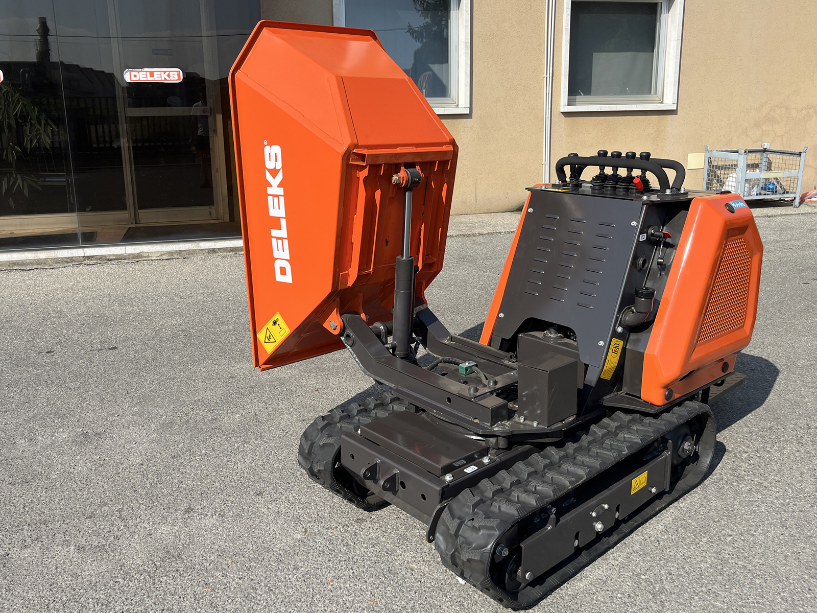 DELEKS® M8000R-KUBOTA professional tracked mini dumper with 180° three-way discharge, hydraulic lift and rotation, hydrostatic transmission, operator platform and Kubota diesel engine with electric start.