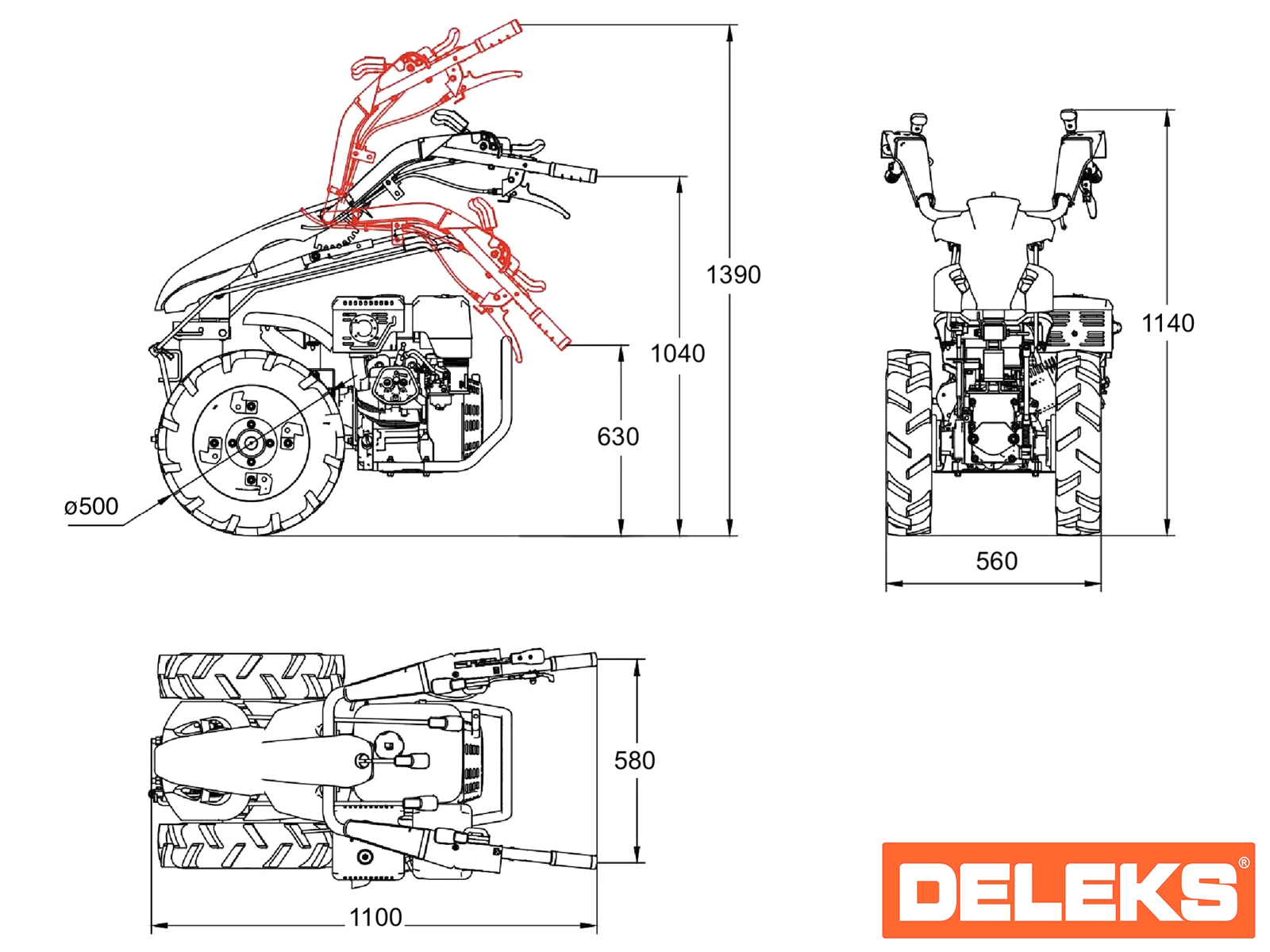 DELEKS® ZEUS-L multi-purpose reversible walking tractor with Loncin 420 cc petrol engine (14 HP), mechanical transmission 3+2 with quick reverse, differential lock and standard female quick hitch.