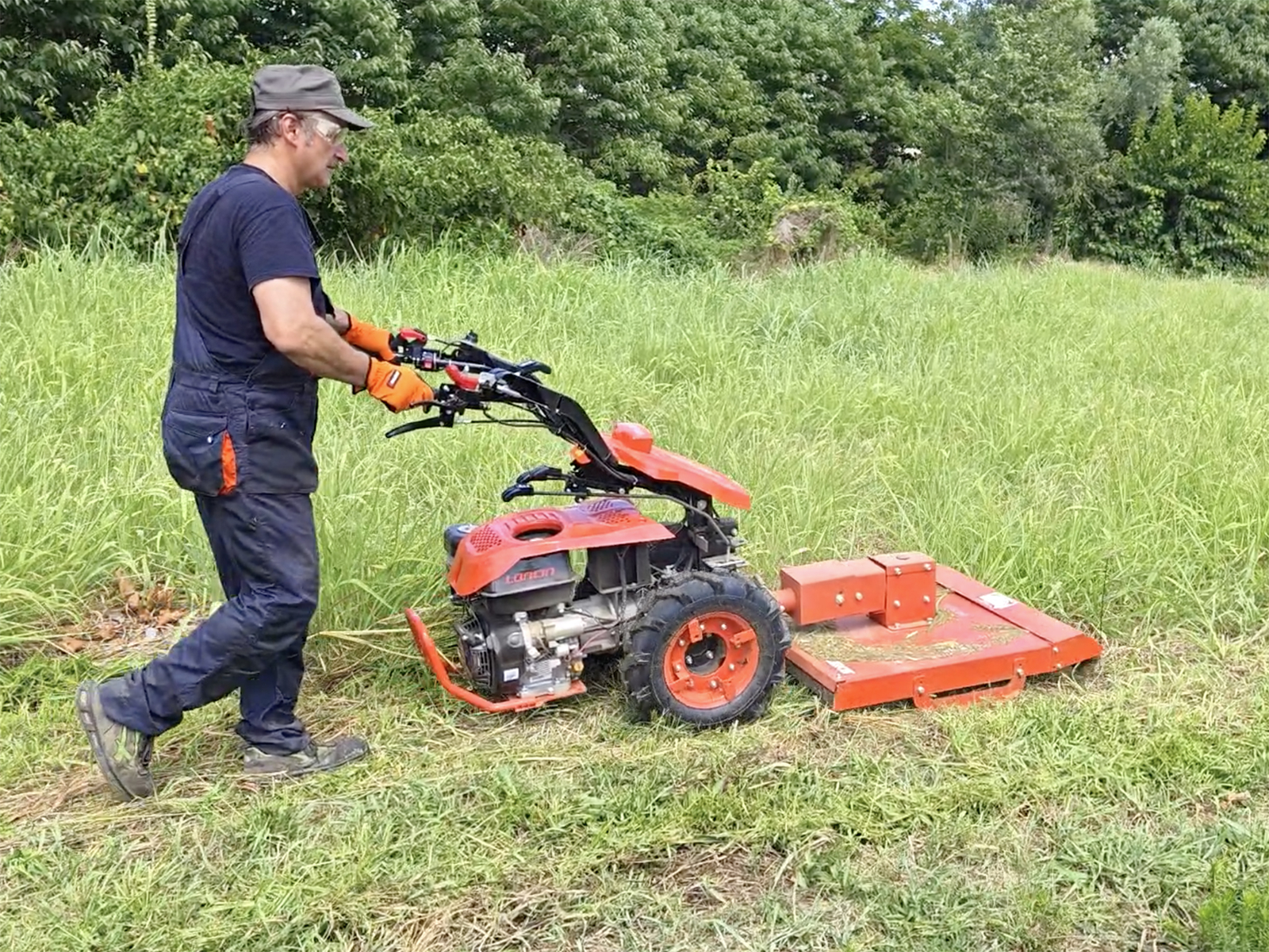 180° reversible handlebar allowing the use of both rear implements (e.g. rotary tiller) and front implements (e.g. flail mower or cutter bar).