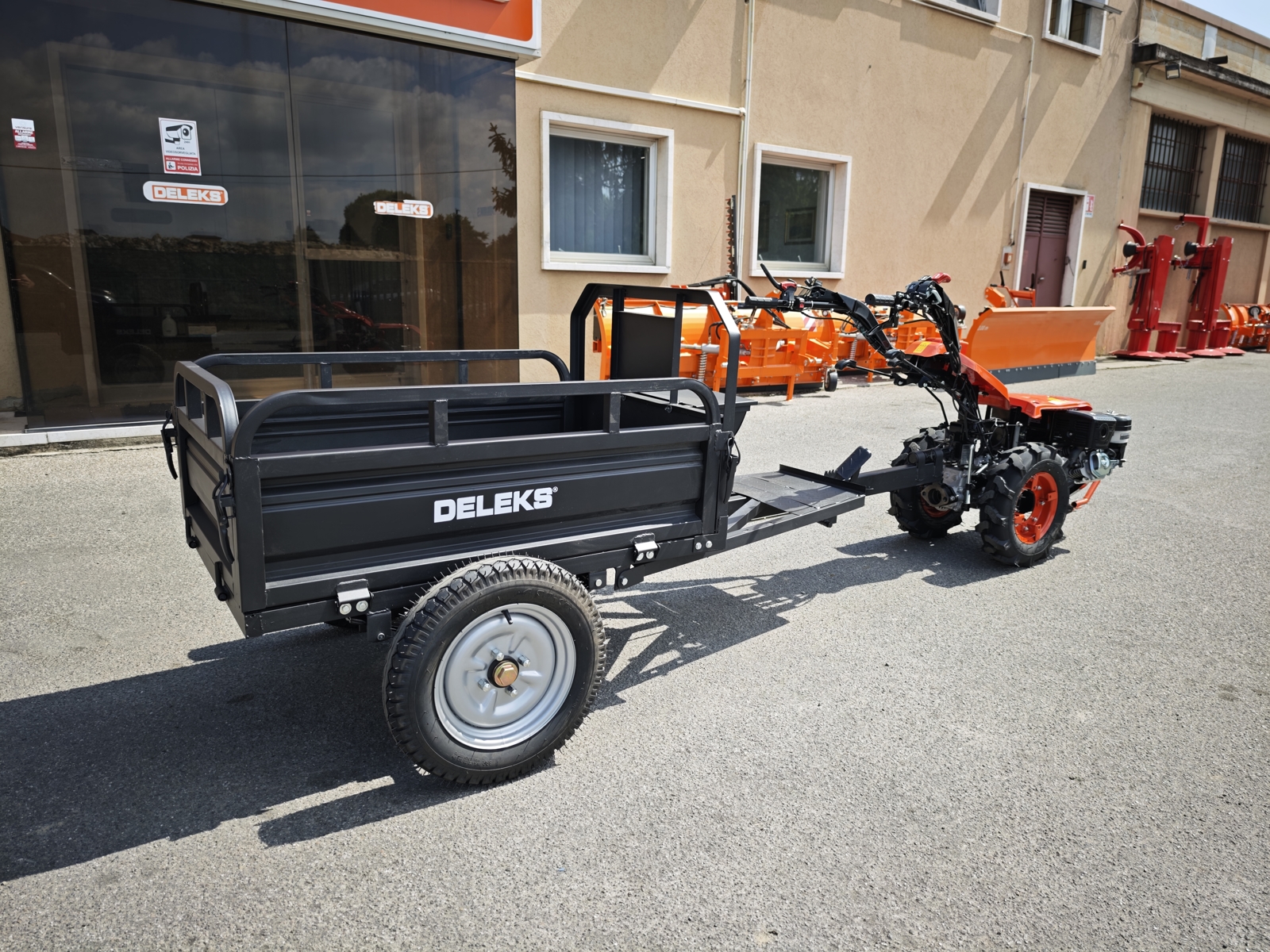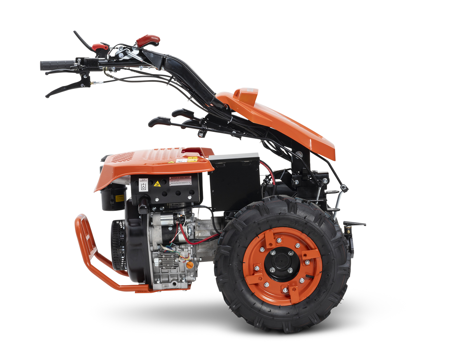 CLOSEProfessional reversible multi-tool walking tractor DELEKS® ZEUS-K with Kama 418 cc diesel engine, electric start with key, mechanical transmission 3+2 with quick reverser, differential lock and standard female quick coupling. Professional 2-wheel tractor designed for agriculture, horticulture, greenhouse work and grounds maintenance with multiple interchangeable implements.