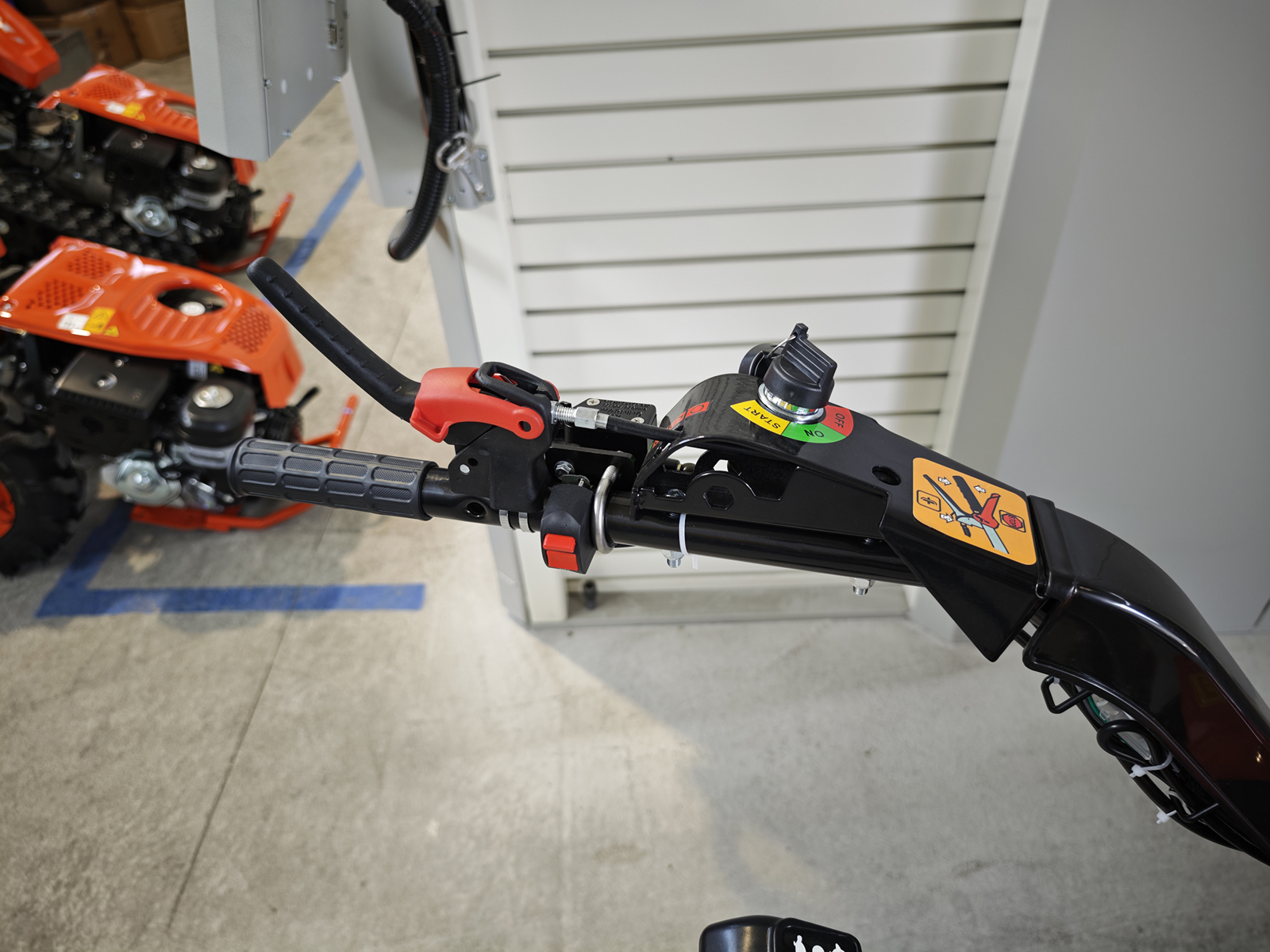 180° reversible handlebars allowing the use of both rear implements (e.g. rotary tiller) and front implements (e.g. flail mower or cutter bar).