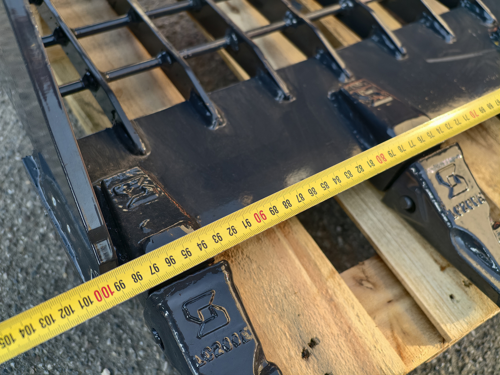 100 cm DELEKS® stone rake bucket designed for S280 mini excavators and for other machines with matching mounting dimensions. Suitable for cleaning, material selection and soil preparation, it separates stones, roots, debris and coarse fractions from fine soil efficiently.