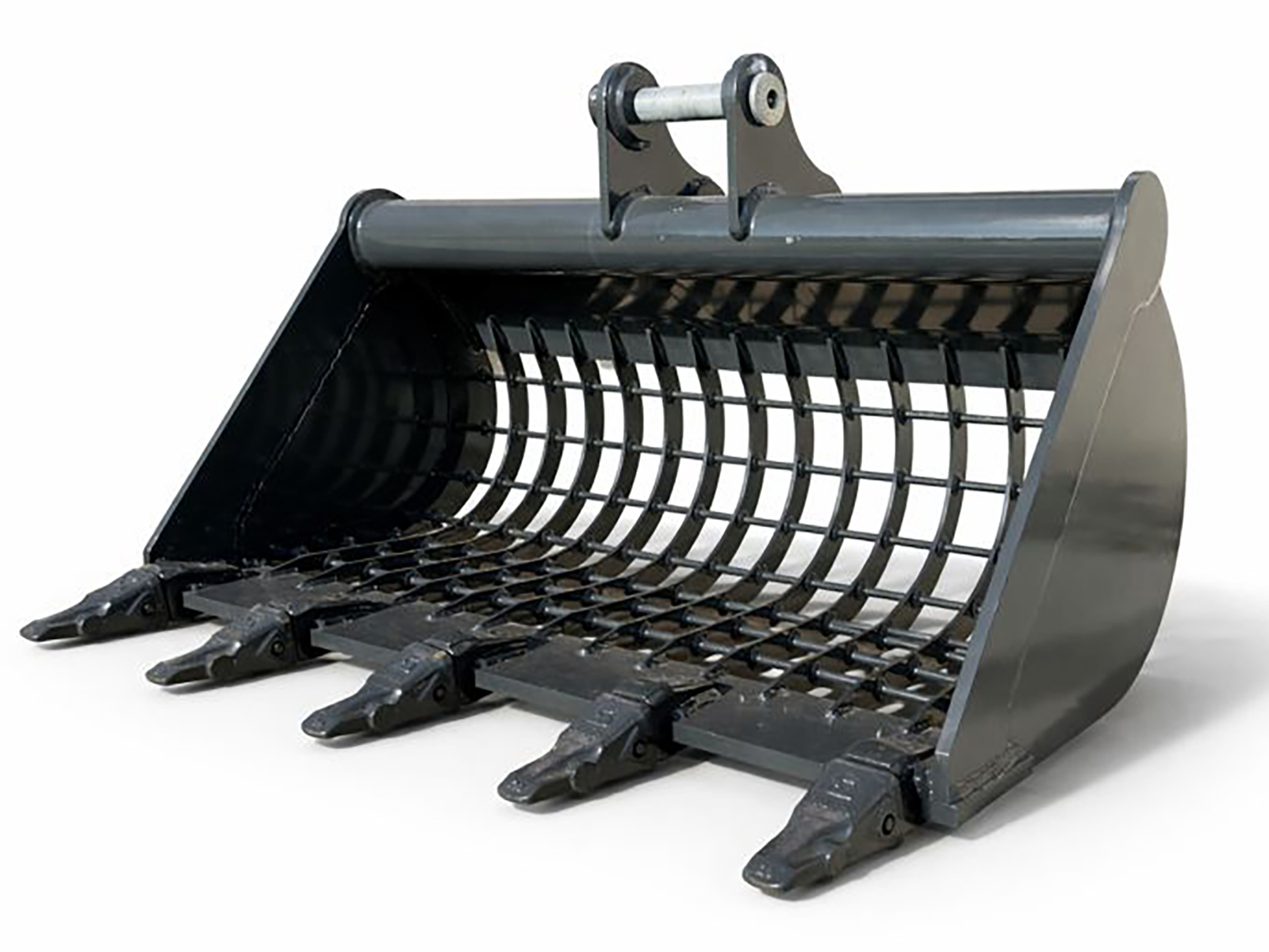 The reinforced open-grid structure, made of high-strength vertical bars, ensures excellent screening capacity and rapid discharge of fine material, reducing waste and allowing reuse of the screened soil fraction.