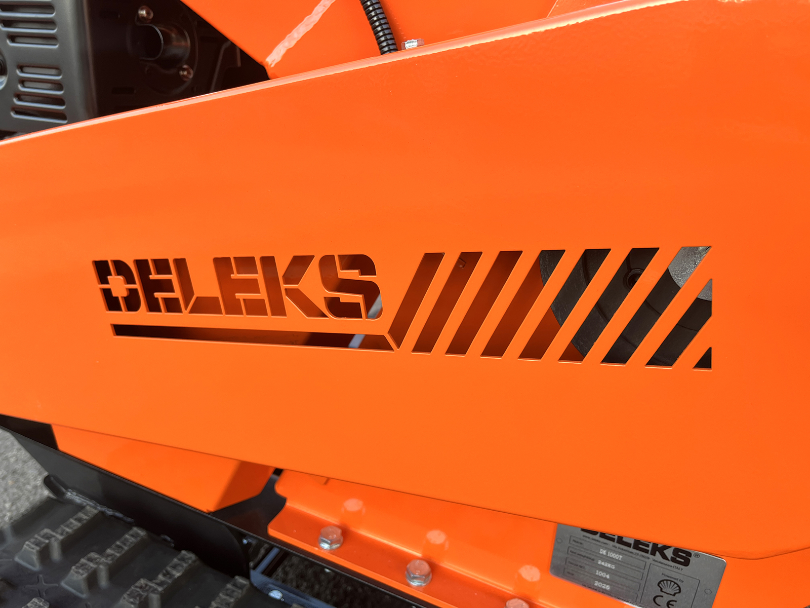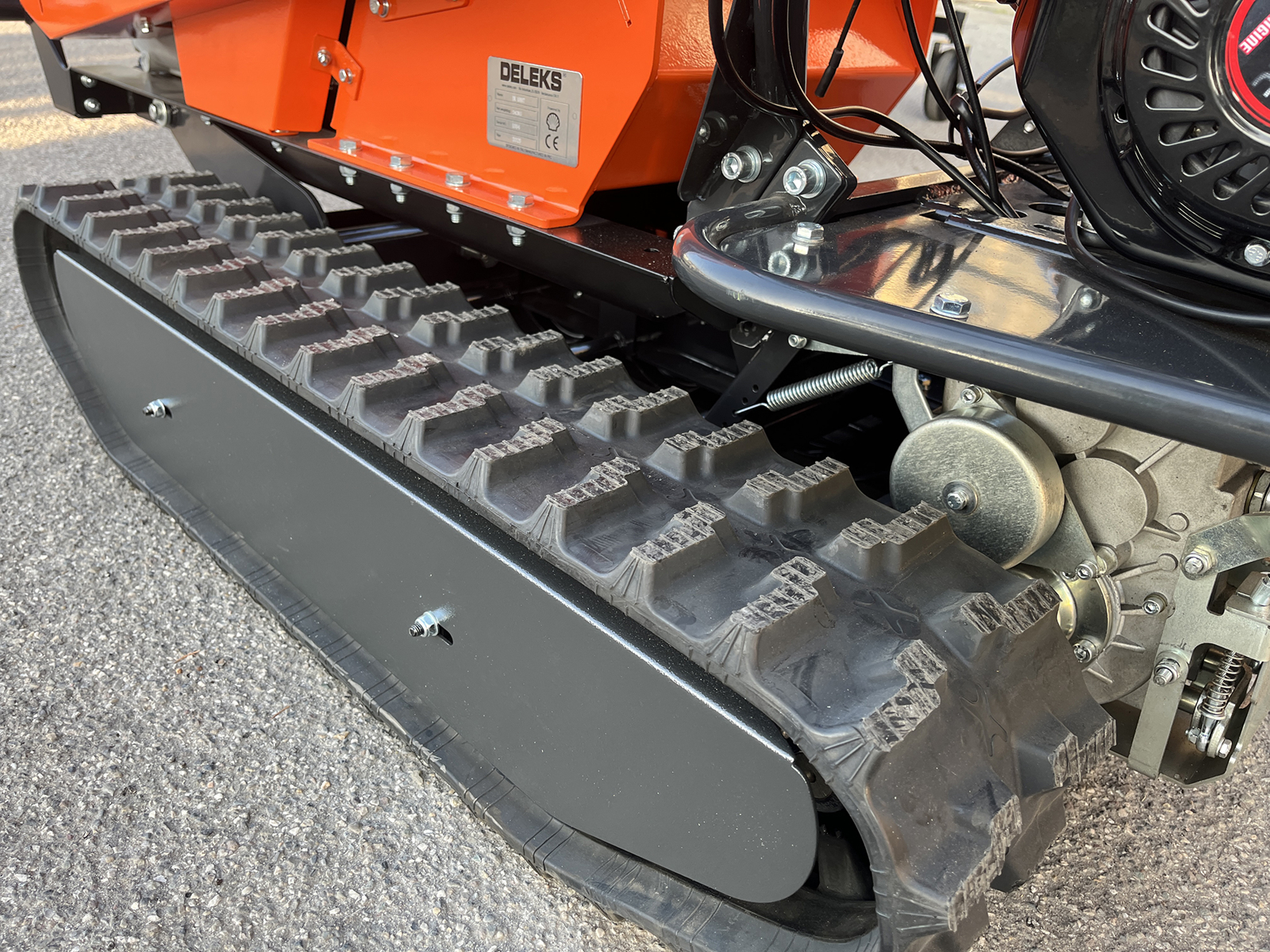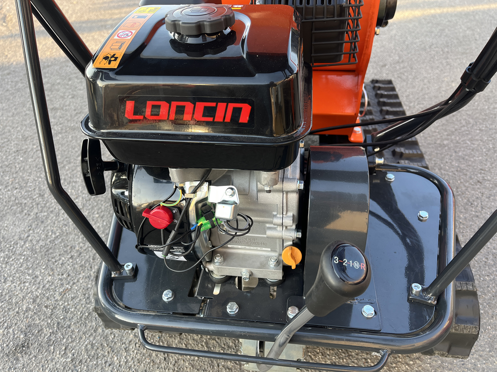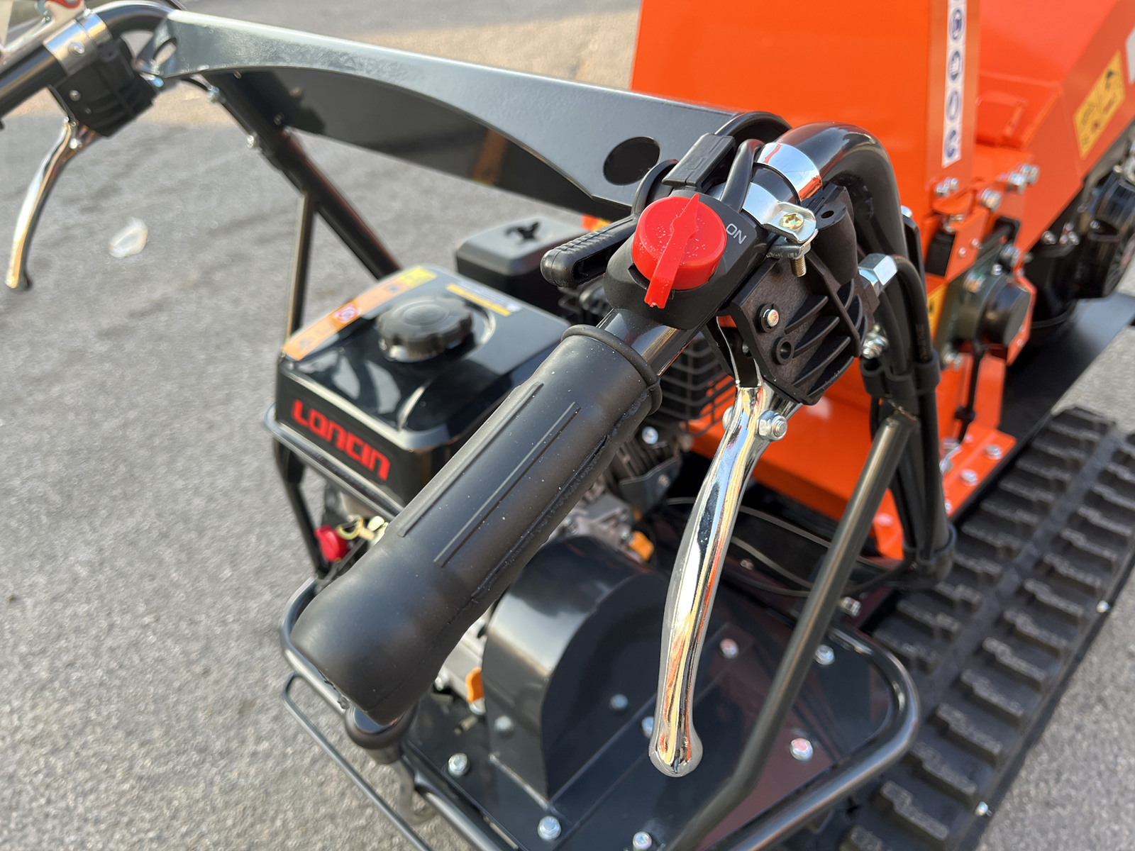 Machine movement is handled by a tracked undercarriage powered by a 196 cc Loncin engine. The system features a mechanical gearbox with 3 forward gears and 1 reverse gear, allowing the operator to adapt travel speed to terrain conditions and working requirements. The tracked drive guarantees constant traction and control, even on uneven or sloped surfaces.