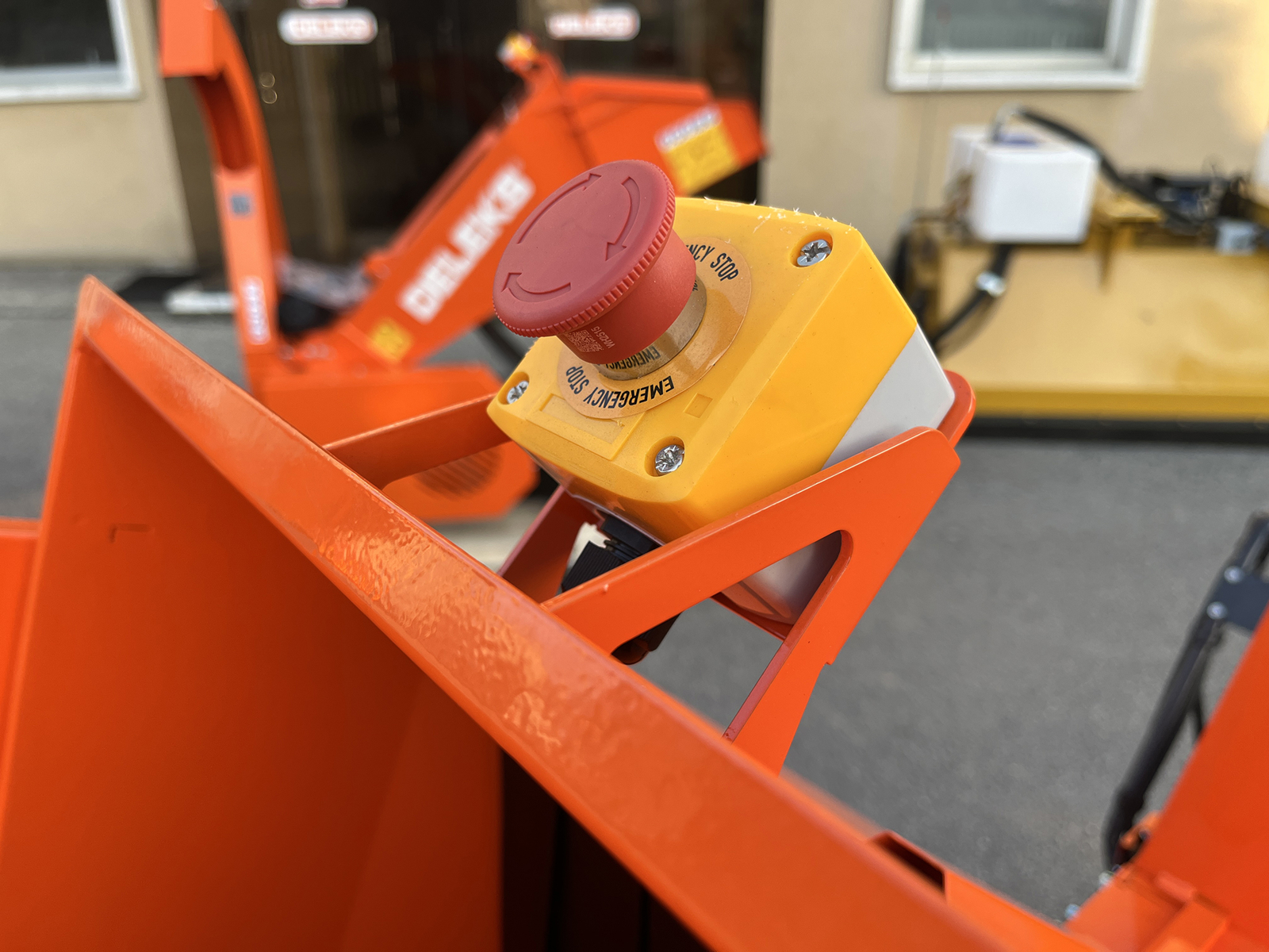 The wood chipper is equipped with an emergency mushroom-type stop device, allowing immediate shutdown of the cutting system when required. The feed hopper can be folded closed, preventing exposure of the cutting system when the machine is parked or transported. All protective systems are designed to comply with current safety regulations.