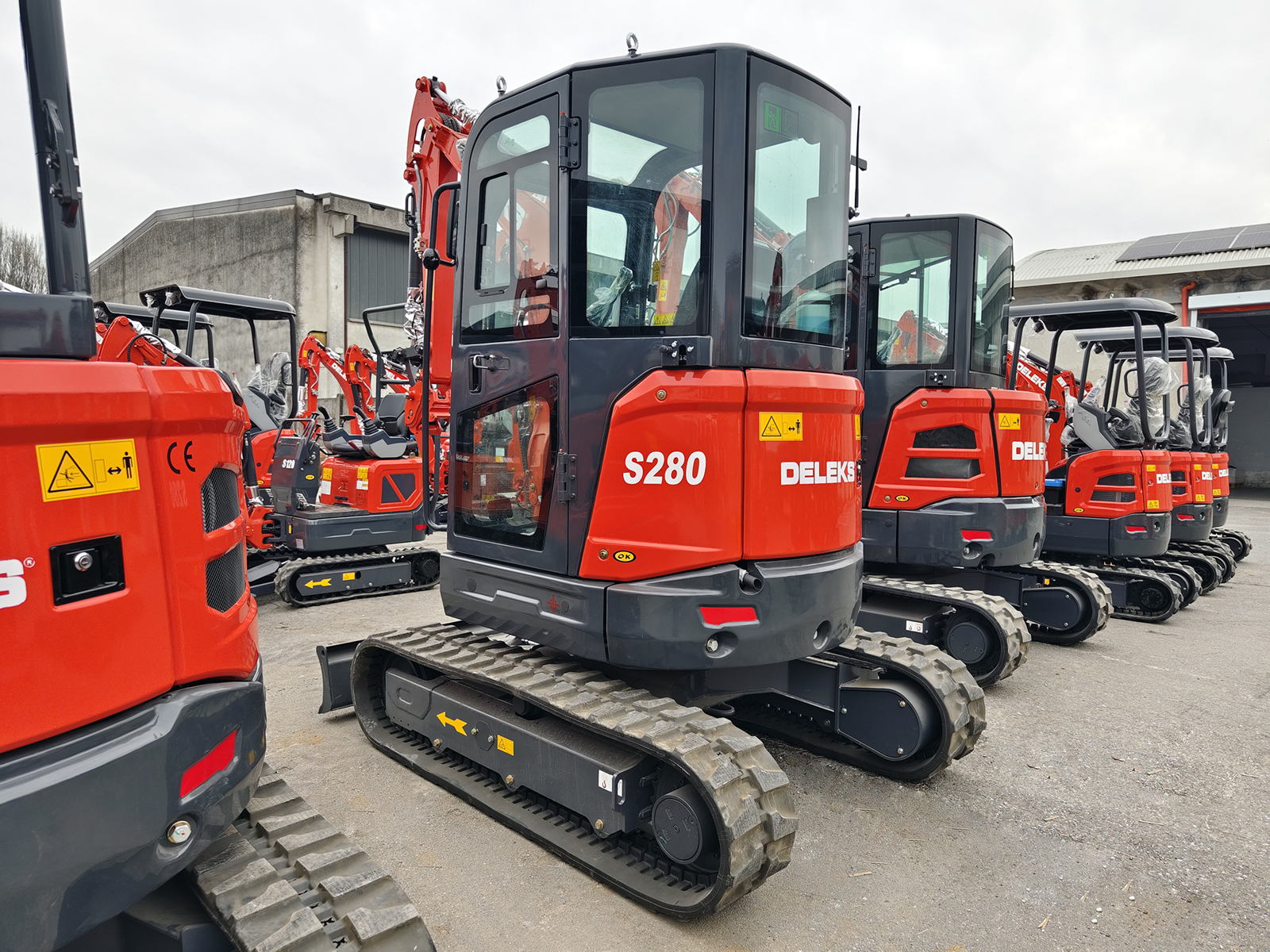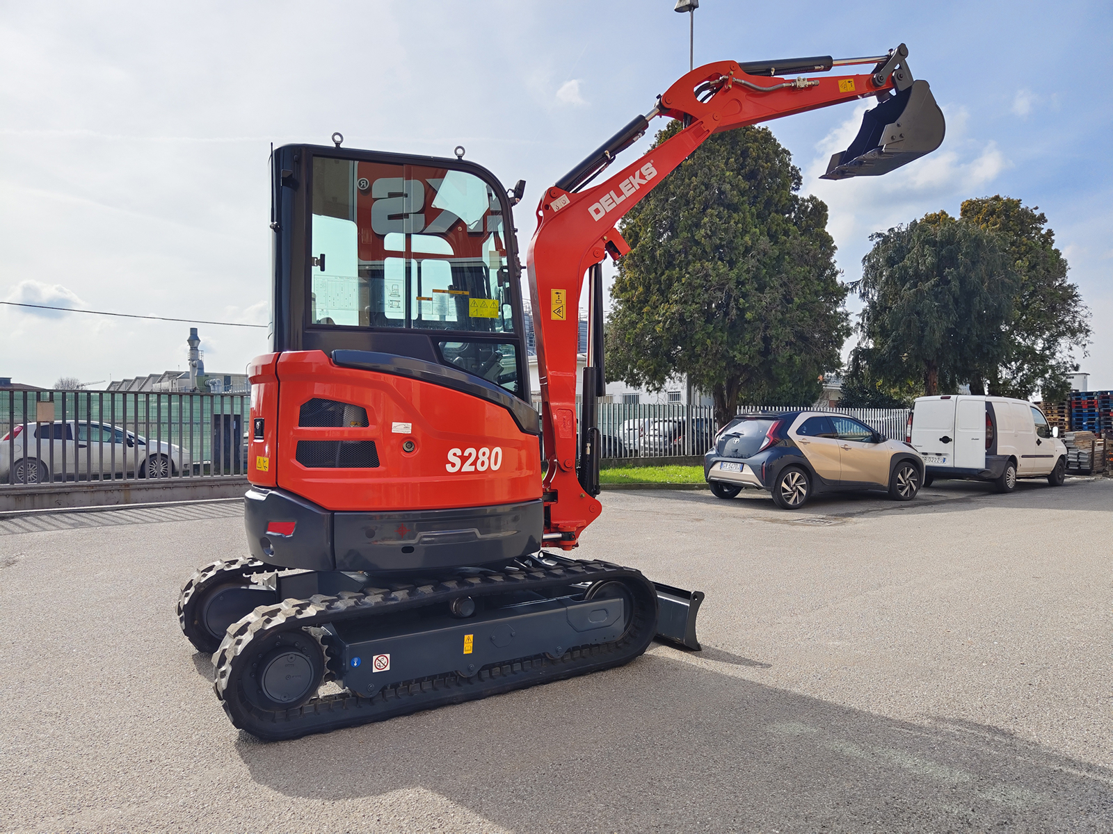 DELEKS® S280CK 2.8 t cab mini excavator, equipped with a Kubota D1105 Stage V 3-cylinder engine (1123 cc), heated cab, offset boom and dual travel speed up to 4 km/h.