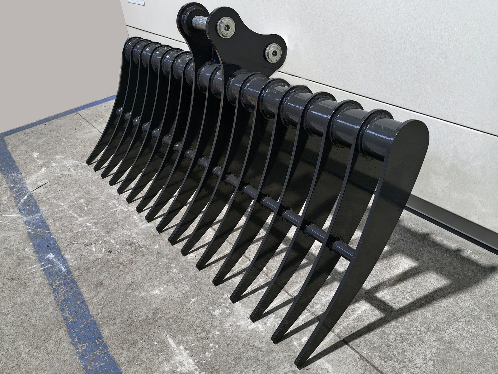 The DELEKS® 150 cm multiripper bucket / rake for mini excavators is a professional attachment for ground cleaning, light ripping and material separation, compatible with DELEKS® S380, also known as a mini excavator rake, is designed for cleaning, light ripping, levelling and material separation directly on the ground.