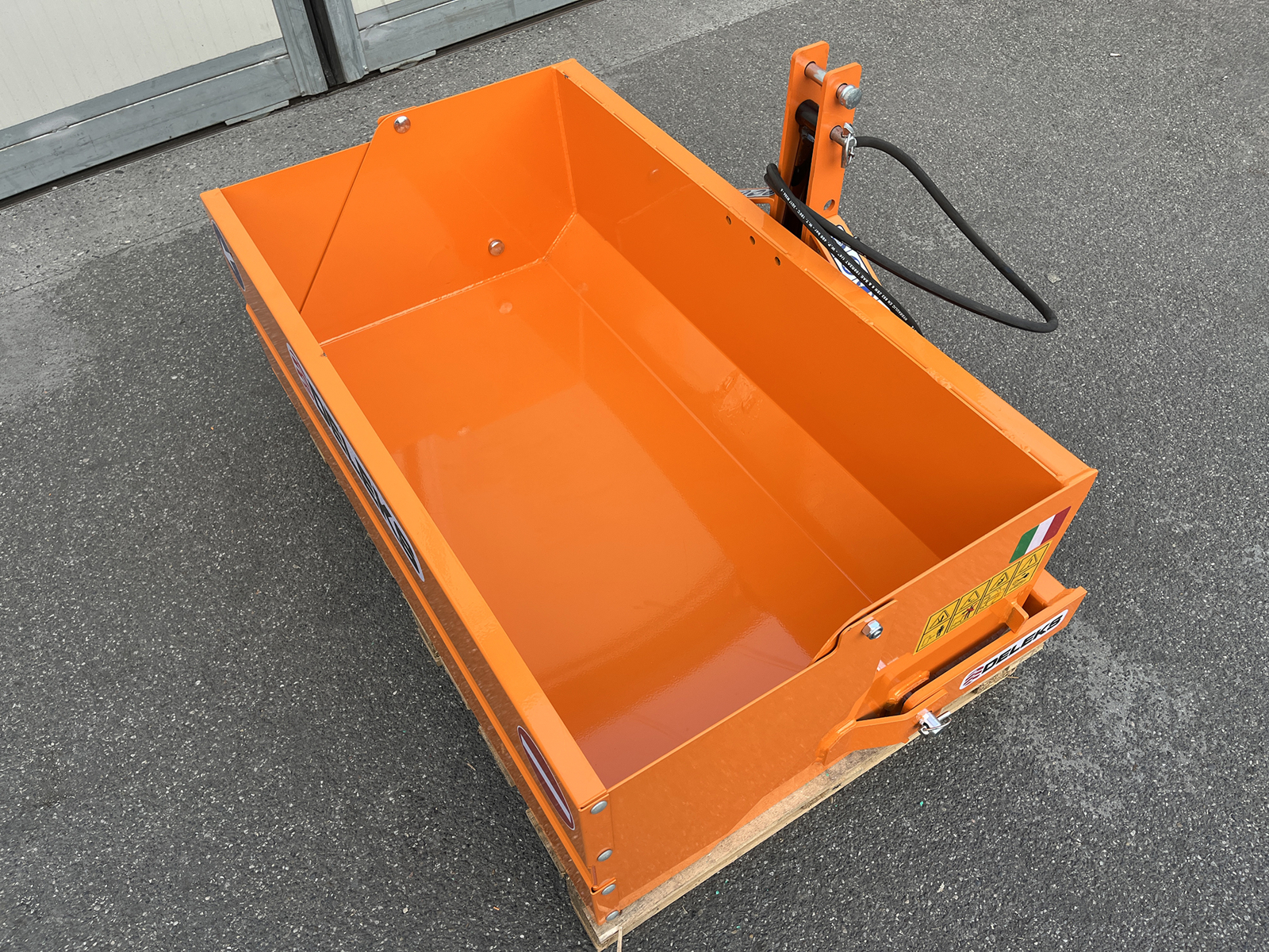 Hydraulic Transportbox 120cm DELEKS® - max load 400kg, made by Hardox and SSAB steel, for compact tractors, hydraulic tipping system - 1.0 cm hardened steel base.