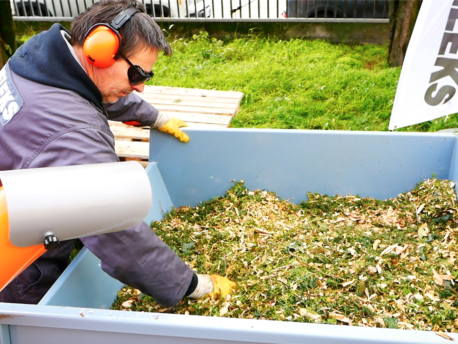 Reinforced discharge chute made of heavy-gauge tubular steel. The 165 cm discharge height allows material to be discharged directly into containers, compost bins or onto a van bed. The discharge direction can be adjusted or the chute removed in seconds using butterfly clamps.