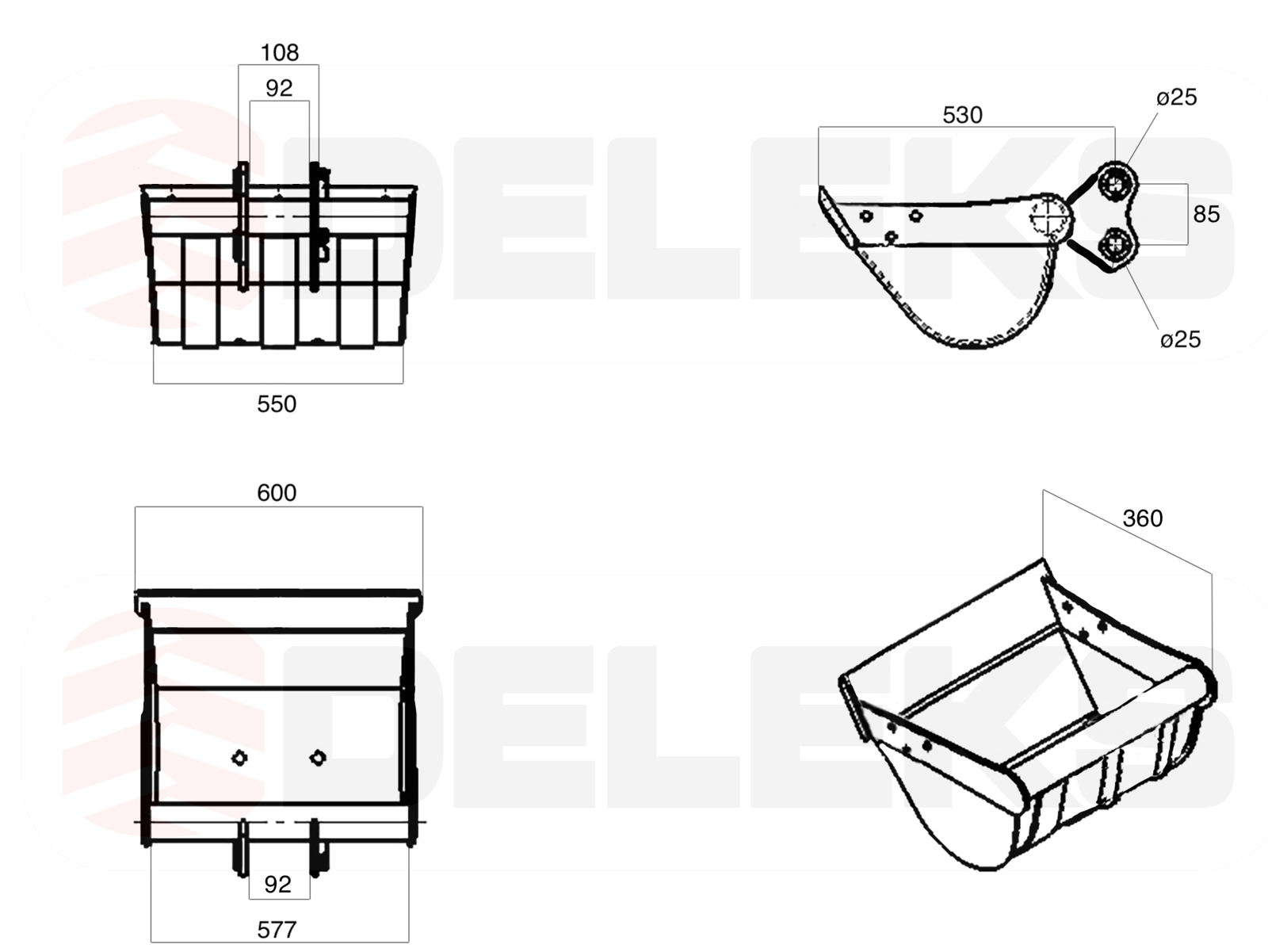 Tilt Bucket 60cm, for M80/M90/M100/M120 DELEKS® Miniexcavators, Tilting Ditch Cleaning Bucket, general duty.