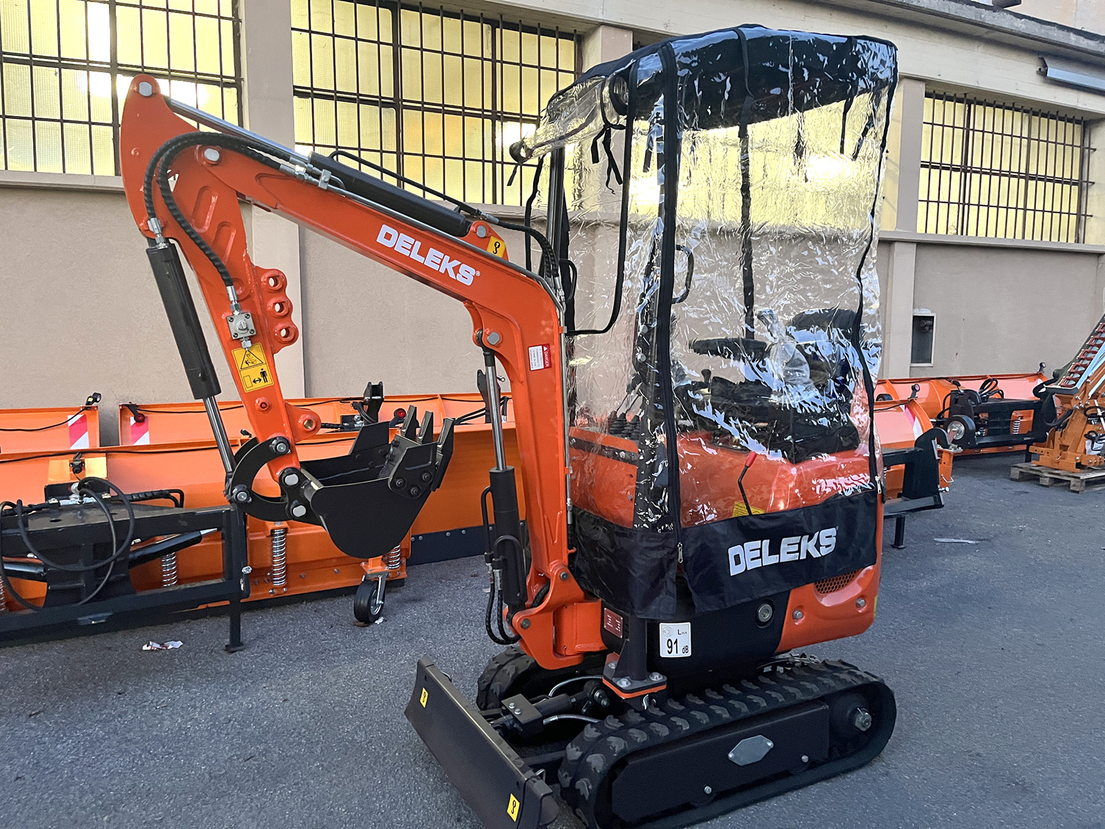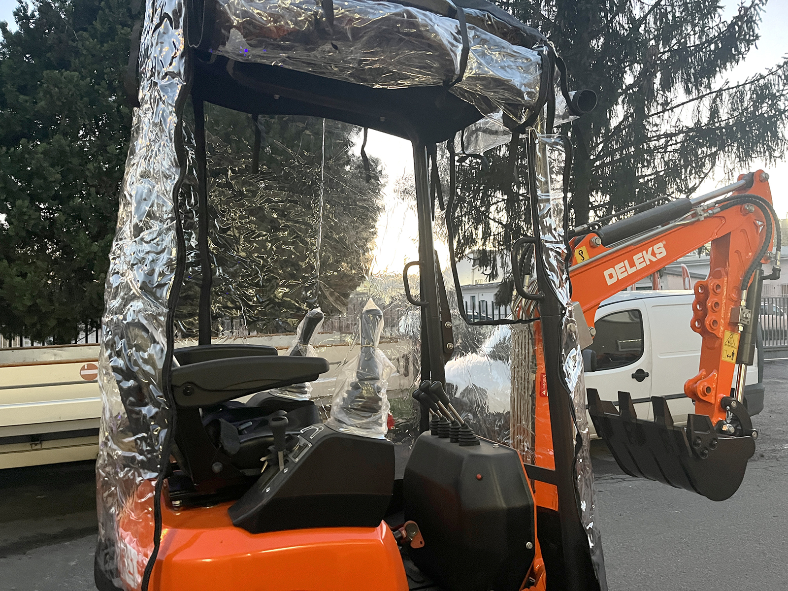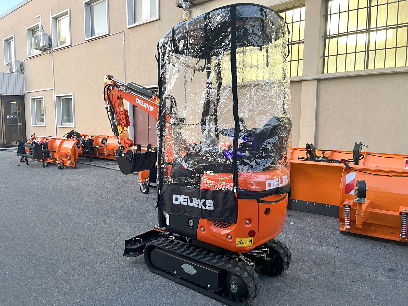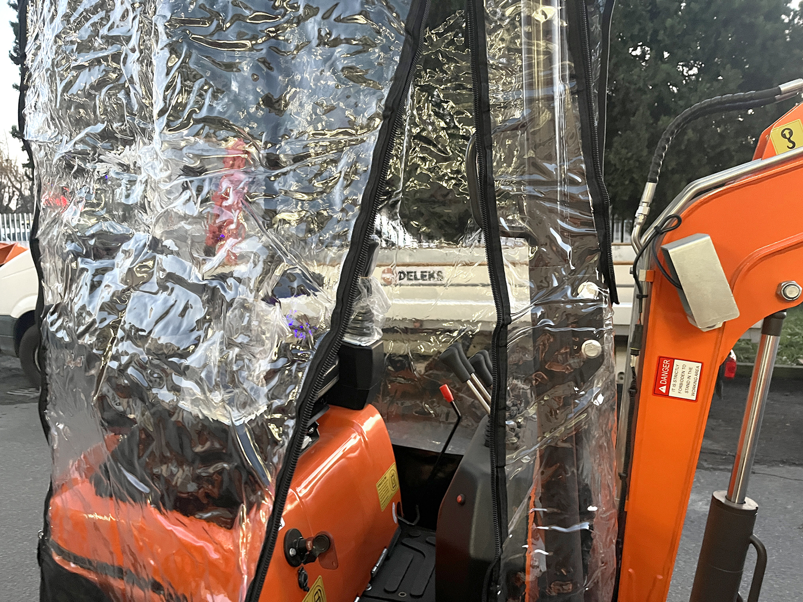 CLOSEDELEKS® protective cover against wind and rain, specifically designed for DELEKS® mini excavators M100, M100se, M130, S120.