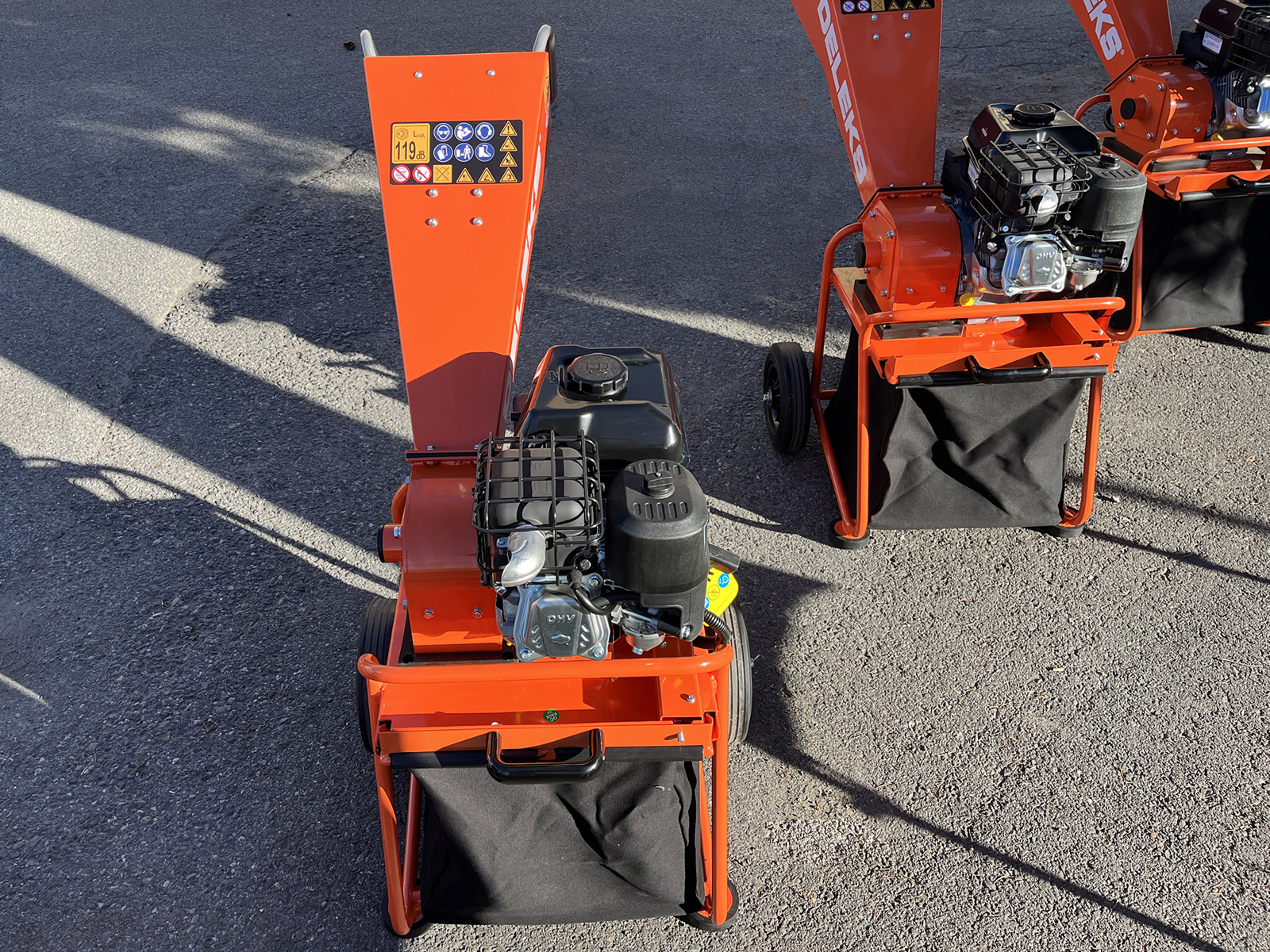 CLOSECompact wood chipper DELEKS® DK-300 BS powered by a Briggs & Stratton XR950 petrol engine delivering 6.5 HP, designed for chipping branches and pruning waste in domestic and semi-professional applications.